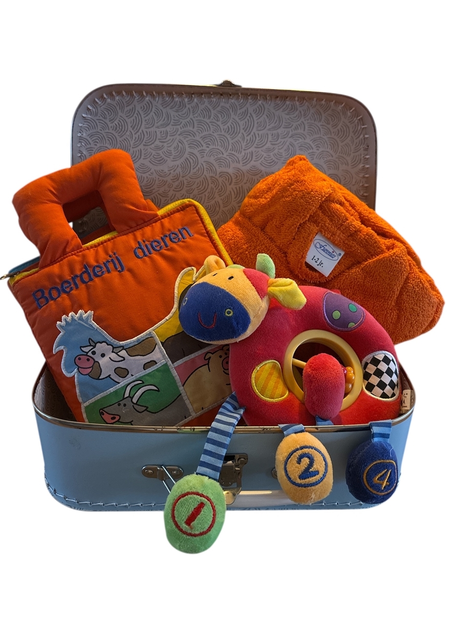 EEen vrolijk gevuld kadokoffertje met boerderijdieren-thema, zachte babyitems en een leerzaam speelelement. Perfect als origineel kraamcadeau of babyshowergeschenk.