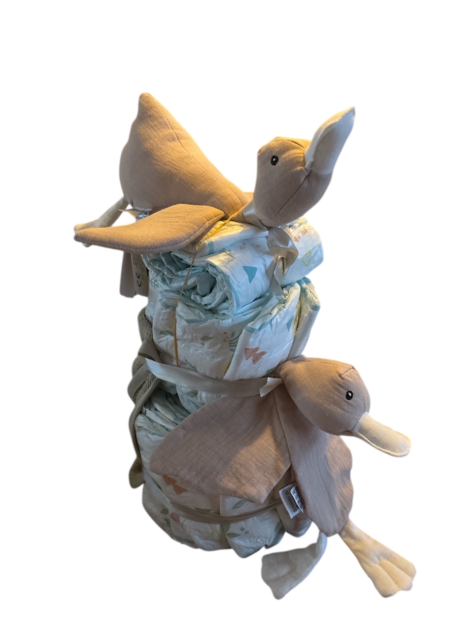Een stijlvolle luiertaart in crème kleur met schattige eendjes. Praktisch én decoratief, perfect als kraamcadeau voor een pasgeboren baby.