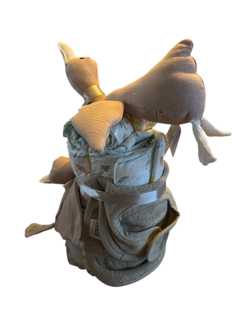 De natuurlijke cremetint geeft de luiertaart een moderne, tijdloze uitstraling en past perfect in zowel een neutrale als botanische babykamer. Dankzij de combinatie van bruikbare babyproducten en een speels design is deze luiertaart niet alleen mooi om te geven, maar ook echt nuttig voor de ouders.