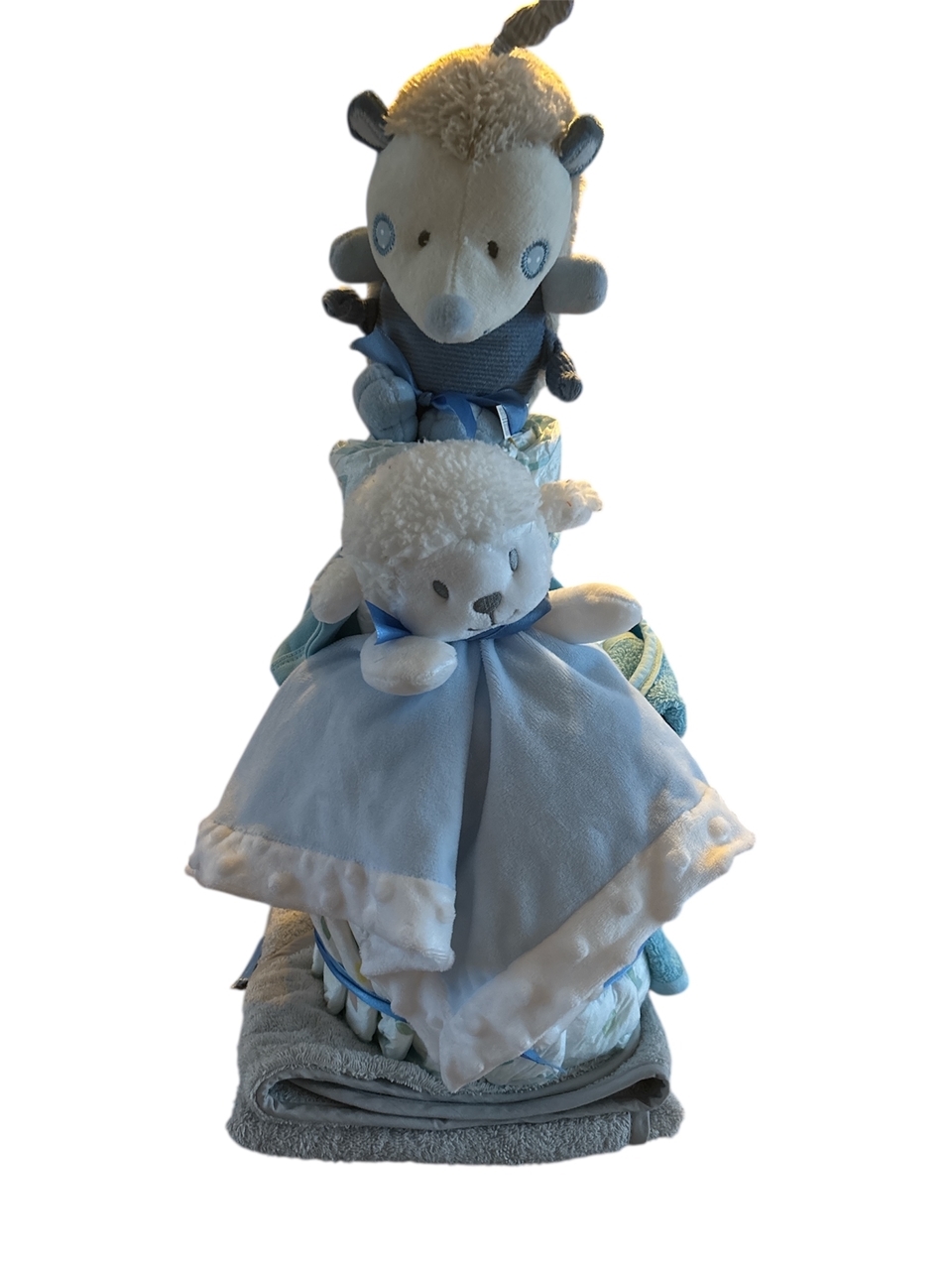 Luxe grijs/blauwe luiertaart met Egel knuffel, tutdoek schaap, romper, slab, badcape en Pampers. Stijlvol kraamcadeau. Handgemaakt en klaar om te geven!