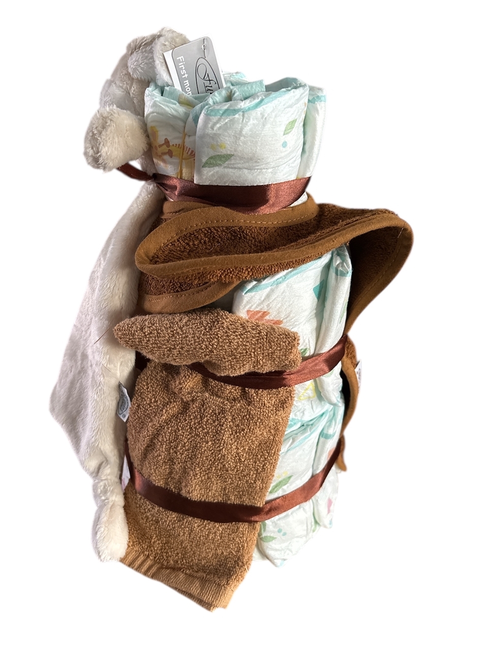 Deze handgemaakte luiertaart met tutdoek hond in de rustgevende bruin tinten is een prachtig en praktisch kraamcadeau. De luiertaart is zorgvuldig opgebouwd met kwalitatieve luiers en afgewerkt met zachte textielproducten en lief knuffeldoek.