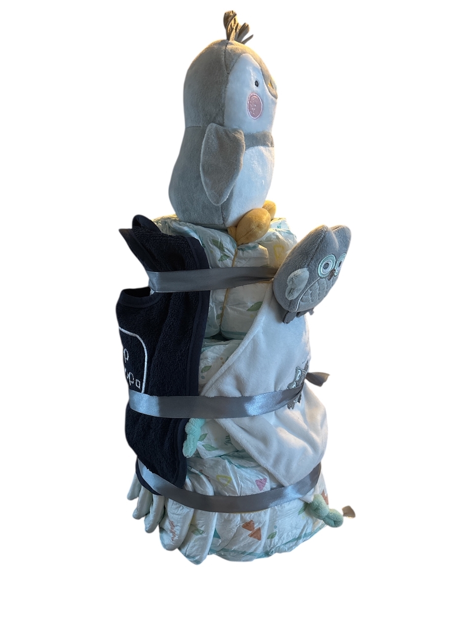 Luxe luiertaart met knuffel en tutdoek uil van Tiamo, spuugdoek, slab, slofjes en Pampers. Stijlvol kraamcadeau. Handgemaakt en klaar om te geven!